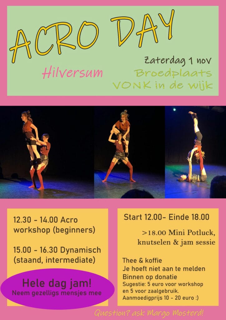 Zaterdag 1 nov – een hele dag acro fun! Sluit je aan wanneer je wilt/kunt, voor workshops of puur voor vrije oefening. Er zijn meerdere ruimtes te gebruiken. Mix van acro yoga & staande acro.