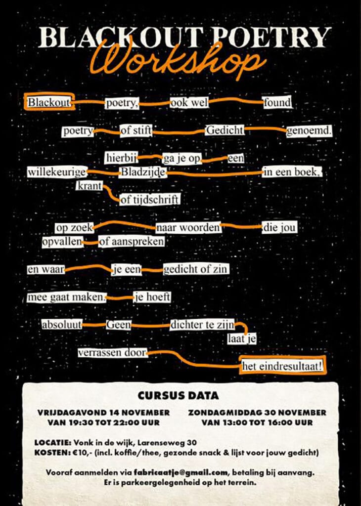 Blackout poetry is een vorm van ‘found poetry’ waarbij je woorden selecteert uit een bestaande tekst (zoals een krant, boek of tijdschrift) en de rest van de tekst wegstreept met een zwarte stift, balpen of gekleurde stiften om zo een nieuw, origineel gedicht te creëren. De overgebleven woorden vormen de tekst van het gedicht, terwijl de weggestreepte delen een visuele achtergrond vormen, die soms ook bijdraagt aan de betekenis van het gedicht. Aan het eind van de avond neem je een mooi gedicht in een lijst mee naar huis.
