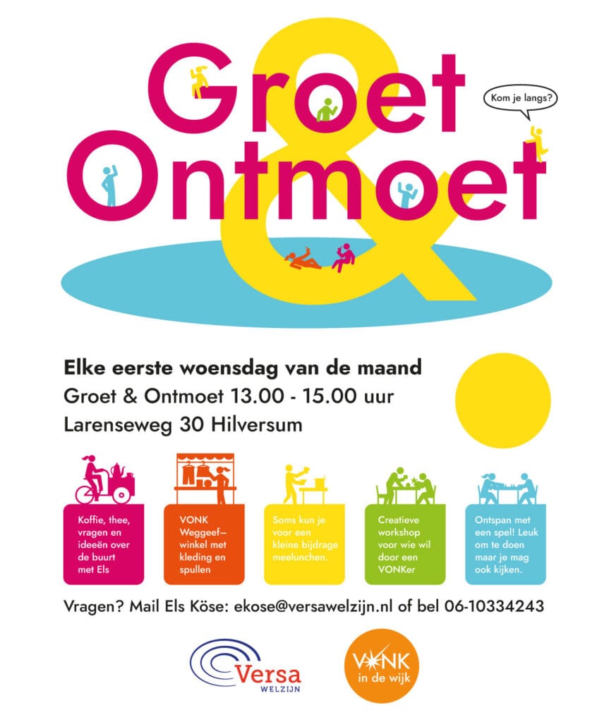 Iedere 1e woensdag van de maand van 13.00 tot 15.00 uur kun je bij VONK in de wijk terecht voor een gezellige of nuttige of creatieve bijeenkomst: Groet en ontmoet elkaar onder het genot van een kopje koffie of thee.
